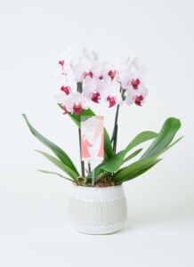 ギフトとして胡蝶蘭を贈る際には、お花を華やかに見せる明るめのラッピングを選ぶとよりお花が引き立ちます。また、胡蝶蘭のお花の色やお生まれになったお子様の性別に合わせたお色を選んでいただけます。